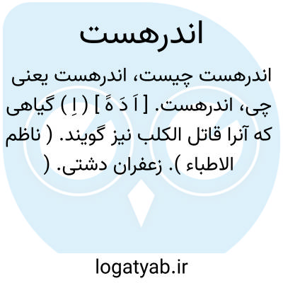اندرهست. [ اَ دَ هََ ] ( اِ ) گیاهی که آنرا قاتل الکلب نیز گویند. ( ناظم الاطباء ). زعفران دشتی. ( آنندراج ). و رجوع به قاتل الکلب شود.
