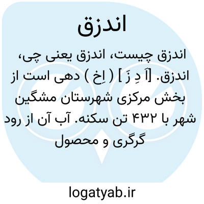 لغت نامه دهخدا اندزق. [اَ دِ زَ ] ( اِخ ) دهی است از بخش مرکزی شهرستان مشگین شهر با 432 تن سکنه. آب آن از رود گرگری و محصول آن غلات و حبوب است. ( از فرهنگ جغرافیایی ایران ج 4 ).