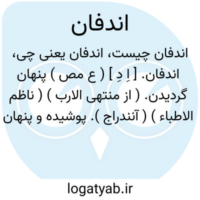 اندفان. [ اِ دِ ] ( ع مص ) پنهان گردیدن. ( از منتهی الارب ) ( ناظم الاطباء ) ( آنندراج ). پوشیده و پنهان شدن. ( از اقرب الموارد ). || انباشته شدن چاه و مانند آن. ( منتهی الارب ) ( ناظم الاطباء ) ( آنندراج ). انباشته شدن. ( تاج المصادر بیهقی ).