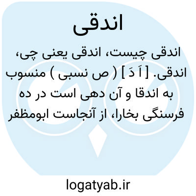 اندقی. [ اَ دَ ] ( ص نسبی ) منسوب به اندقا و آن دهی است در ده فرسنگی بخارا، از آنجاست ابومظفر عبدالکریم بن ابی حنیقةبن عباس اندقی درگذشته به سال 481 هَ.ق. که مردی فقیه و فاضل بود. ( از لباب الانساب ).