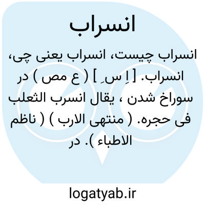 انسراب. [ اِ س ِ ] ( ع مص ) در سوراخ شدن، یقال انسرب الثعلب فی حجره. ( منتهی الارب ) ( ناظم الاطباء ). در سرب شدن. ( تاج المصادر بیهقی ). در سوراخ شدن روباه. ( آنندراج ). داخل شدن حیوان وحشی در سوراخ خود. تسرب. ( از اقرب الموارد ). || درازشدن چیزی. ( منتهی الارب ) ( ناظم الاطباء ) ( آنندراج ).