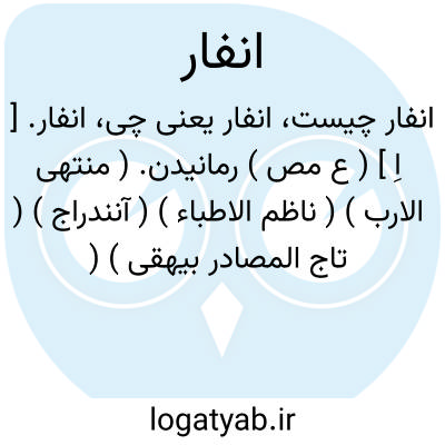 لغت نامه دهخدا انفار. [ اِ ] ( ع مص ) رمانیدن. ( منتهی الارب ) ( ناظم الاطباء ) ( آنندراج ) ( تاج المصادر بیهقی ) ( از اقرب الموارد ). || یاری دادن. ( منتهی الارب ) ( ناظم الاطباء ) ( آنندراج ). نصرت دادن و مدد کردن. ( از اقرب الموارد ). || دراز کشیدن. ( منتهی الارب ) ( ناظم الاطباء ). || خداوند شتران رمنده ونافر شدن. ( منتهی الارب ) ( ناظم الاطباء ) ( آنندراج ) ( از اقرب الموارد ). || حکم کردن به غلبه کسی بر کسی. ( تاج المصادر بیهقی ) ( از اقرب الموارد ): انفر علیه؛ به چیرگی حکم کرد بر وی. ( منتهی الارب ) ( ناظم الاطباء ). به چیرگی حکم کردن بر کسی. ( آنندراج ).انفار. [ اَ ] ( ع اِ ) ج ِ نَفَر. ( منتهی الارب ) ( از اقرب الموارد ) ( ناظم الاطباء ). رجوع به نفر شود.
