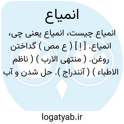 لغت نامه دهخدا انمیاع. [ اِ ] ( ع مص ) گداختن روغن. ( منتهی الارب ) ( ناظم الاطباء ) ( آنندراج ). حل شدن و آب شدن. ذوب شدن. ( از اقرب الموارد ):و کان لینا سریع التفتت و الانمیاع. ( ابن البیطار ).