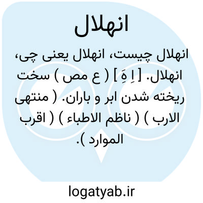 انهلال. [ اِ هَِ ] ( ع مص ) سخت ریخته شدن ابر و باران. ( منتهی الارب ) ( ناظم الاطباء ) ( اقرب الموارد ). ریخته شدن. ( المصادر زوزنی ). || باران نازل کردن آسمان. ( از اقرب الموارد ). || روان شدن اشک. ( منتهی الارب ) ( ناظم الاطباء ) ( اقرب الموارد ).