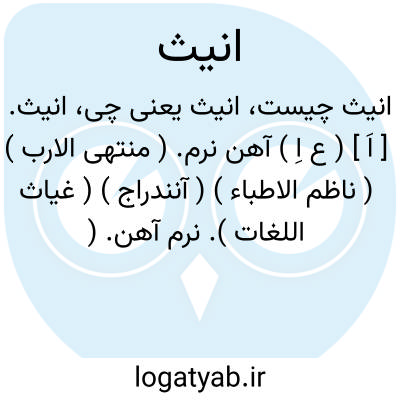 انیث. [ اَ ] ( ع اِ ) آهن نرم. ( منتهی الارب ) ( ناظم الاطباء ) ( آنندراج ) ( غیاث اللغات ). نرم آهن. ( مهذب الاسماء ). مقابل ذَکَرپولاد. || ( ص ) مکان انیث؛ که در آن رستنی زود بروید. ( از اقرب الموارد ).