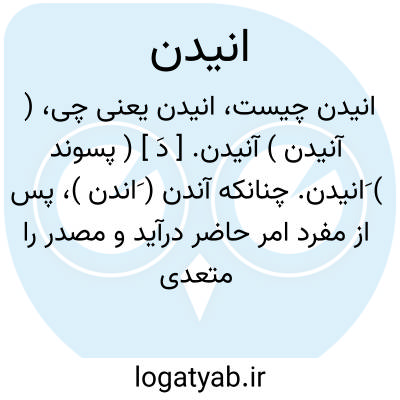 ( آنیدن ) آنیدن. [ دَ ] ( پسوند ) َانیدن. چنانکه آندن ( َاندن )، پس از مفرد امر حاضر درآید و مصدر را متعدی کند: کنانیدن. خورانیدن. خیزانیدن. گیرانیدن. ایستانیدن. خندانیدن.