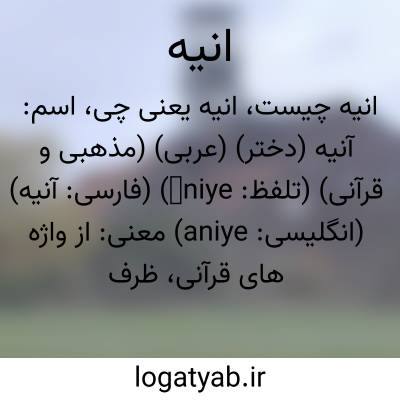 اسم: آنیه (دختر) (عربی) (مذهبی و قرآنی) (تلفظ: āniye) (فارسی: آنيه) (انگلیسی: aniye)