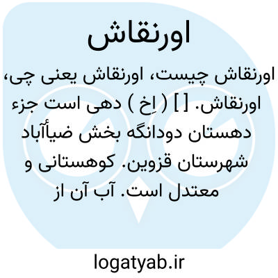 اورنقاش. [ ] ( اِخ ) دهی است جزء دهستان دودانگه بخش ضیأآباد شهرستان قزوین. کوهستانی و معتدل است. آب آن از قنات و چشمه و در بهار از رود محلی و محصول آنجاغلات و شغل اهالی زراعت، قالی، گلیم و جاجیم بافی است. راه مالرو دارد. ( از فرهنگ جغرافیائی ایران ج 1 ).