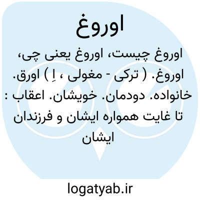 اوروغ. ( ترکی - مغولی، اِ ) اورق. خانواده. دودمان. خویشان. اعقاب: تا غایت همواره ایشان و فرزندان ایشان ملازم و مقرب حضرت هولاکوخان و اوروغ نامدار بودند. ( جامعالتواریخ رشیدی ). و این ملک بر وی و اوروغ نامدار وی بر وجهی که هست مقررو مسلم بود. ( همان کتاب ). رجوع به ماده بعد شود.