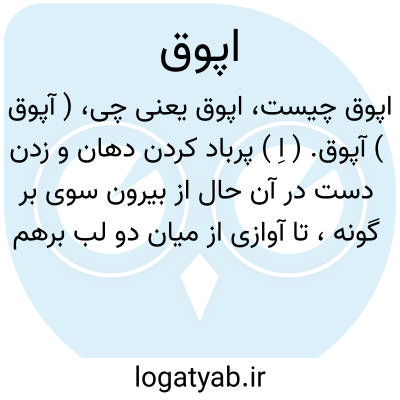 ( آپوق ) آپوق. ( اِ ) پرباد کردن دهان و زدن دست در آن حال از بیرون سوی بر گونه، تا آوازی از میان دو لب برهم آورده برآید. لپق.