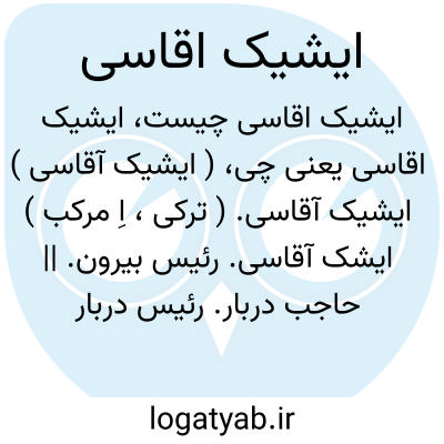 ( ایشیک آقاسی ) ایشیک آقاسی. ( ترکی، اِ مرکب ) ایشک آقاسی. رئیس بیرون. || حاجب دربار. رئیس دربار صفویان. || داروغه دیوانخانه. ( فرهنگ فارسی معین ). داروغه دیوانخانه چه ایشیک به معنی فضای دروازه و آقاسی بمعنی سردار. ( غیاث اللغات ) ( از آنندراج ): فی الحال با علی بیک ایشیک آقاسی بازگشته. ( مزارات کرمان ).