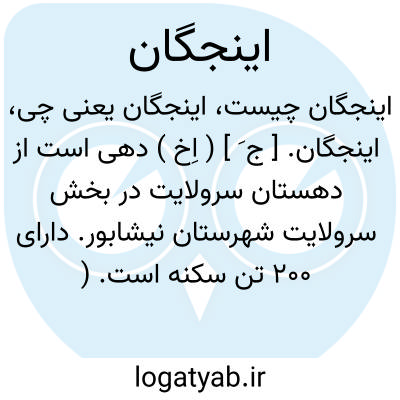 لغت نامه دهخدا اینجگان. [ ج َ ] ( اِخ ) دهی است از دهستان سرولایت در بخش سرولایت شهرستان نیشابور. دارای 200 تن سکنه است. ( از فرهنگ جغرافیایی ایران ج 9 ).