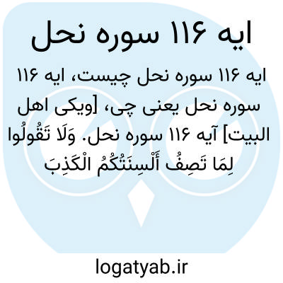 [ویکی اهل البیت] آیه 116 سوره نحل. وَلَا تَقُولُوا لِمَا تَصِفُ أَلْسِنَتُکُمُ الْکَذِبَ هَٰذَا حَلَالٌ وَهَٰذَا حَرَامٌ لِتَفْتَرُوا عَلَی اللَّهِ الْکَذِبَ ۚ إِنَّ الَّذِینَ یَفْتَرُونَ عَلَی اللَّهِ الْکَذِبَ لَا یُفْلِحُونَ