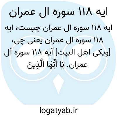 [ویکی اهل البیت] آیه 118 سوره آل عمران. یَا أَیُّهَا الَّذِینَ آمَنُوا لَا تَتَّخِذُوا بِطَانَةً مِنْ دُونِکُمْ لَا یَأْلُونَکُمْ خَبَالًا وَدُّوا مَا عَنِتُّمْ قَدْ بَدَتِ الْبَغْضَاءُ مِنْ أَفْوَاهِهِمْ وَمَا تُخْفِی صُدُورُهُمْ أَکْبَرُ ۚ قَدْ بَیَّنَّا لَکُمُ الْآیَاتِ ۖ إِنْ کُنْتُمْ تَعْقِلُونَ