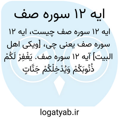 [ویکی اهل البیت] آیه 12 سوره صف. یَغْفِرْ لَکُمْ ذُنُوبَکُمْ وَیُدْخِلْکُمْ جَنَّاتٍ تَجْرِی مِنْ تَحْتِهَا الْأَنْهَارُ وَمَسَاکِنَ طَیِّبَةً فِی جَنَّاتِ عَدْنٍ ۚ ذَٰلِکَ الْفَوْزُ الْعَظِیمُ