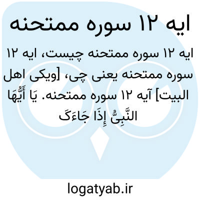 [ویکی اهل البیت] آیه 12 سوره ممتحنه. یَا أَیُّهَا النَّبِیُّ إِذَا جَاءَکَ الْمُؤْمِنَاتُ یُبَایِعْنَکَ عَلَیٰ أَنْ لَا یُشْرِکْنَ بِاللَّهِ شَیْئًا وَلَا یَسْرِقْنَ وَلَا یَزْنِینَ وَلَا یَقْتُلْنَ أَوْلَادَهُنَّ وَلَا یَأْتِینَ بِبُهْتَانٍ یَفْتَرِینَهُ بَیْنَ أَیْدِیهِنَّ وَأَرْجُلِهِنَّ وَلَا یَعْصِینَکَ فِی مَعْرُوفٍ ۙ فَبَایِعْهُنَّ وَاسْتَغْفِرْ لَهُنَّ اللَّهَ ۖ إِنَّ اللَّهَ غَفُورٌ رَحِیمٌ