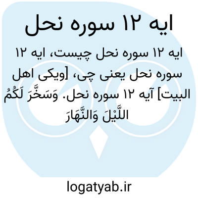 [ویکی اهل البیت] آیه 12 سوره نحل. وَسَخَّرَ لَکُمُ اللَّیْلَ وَالنَّهَارَ وَالشَّمْسَ وَالْقَمَرَ ۖ وَالنُّجُومُ مُسَخَّرَاتٌ بِأَمْرِهِ ۗ إِنَّ فِی ذَٰلِکَ لَآیَاتٍ لِقَوْمٍ یَعْقِلُونَ