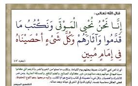 [ویکی اهل البیت] آیه 12 سوره یس. إِنَّا نَحْنُ نُحْیِی الْمَوْتَیٰ وَنَکْتُبُ مَا قَدَّمُوا وَآثَارَهُمْ ۚ وَکُلَّ شَیْءٍ أَحْصَیْنَاهُ فِی إِمَامٍ مُبِینٍ