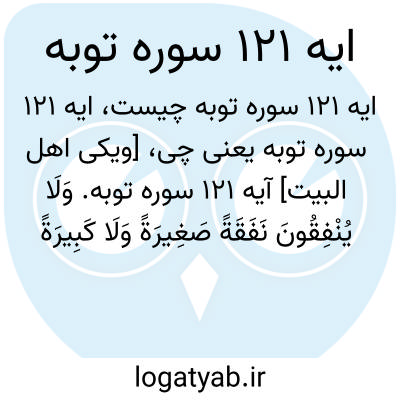 [ویکی اهل البیت] آیه 121 سوره توبه. وَلَا یُنْفِقُونَ نَفَقَةً صَغِیرَةً وَلَا کَبِیرَةً وَلَا یَقْطَعُونَ وَادِیًا إِلَّا کُتِبَ لَهُمْ لِیَجْزِیَهُمُ اللَّهُ أَحْسَنَ مَا کَانُوا یَعْمَلُونَ