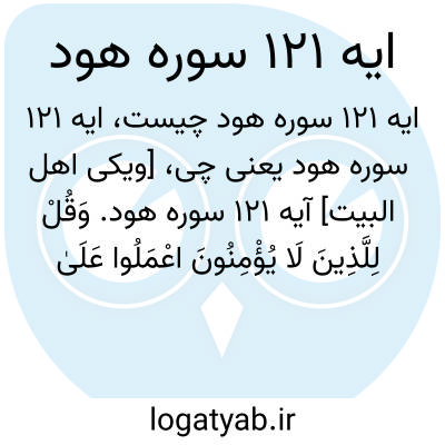 [ویکی اهل البیت] آیه 121 سوره هود. وَقُلْ لِلَّذِینَ لَا یُؤْمِنُونَ اعْمَلُوا عَلَیٰ مَکَانَتِکُمْ إِنَّا عَامِلُونَ