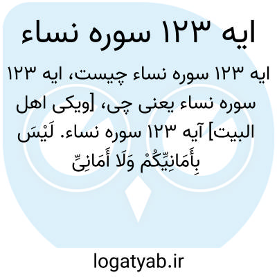 [ویکی اهل البیت] آیه 123 سوره نساء. لَیْسَ بِأَمَانِیِّکُمْ وَلَا أَمَانِیِّ أَهْلِ الْکِتَابِ ۗ مَنْ یَعْمَلْ سُوءًا یُجْزَ بِهِ وَلَا یَجِدْ لَهُ مِنْ دُونِ اللَّهِ وَلِیًّا وَلَا نَصِیرًا