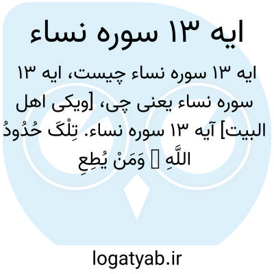 [ویکی اهل البیت] آیه 13 سوره نساء. تِلْکَ حُدُودُ اللَّهِ ۚ وَمَنْ یُطِعِ اللَّهَ وَرَسُولَهُ یُدْخِلْهُ جَنَّاتٍ تَجْرِی مِنْ تَحْتِهَا الْأَنْهَارُ خَالِدِینَ فِیهَا ۚ وَذَٰلِکَ الْفَوْزُ الْعَظِیمُ