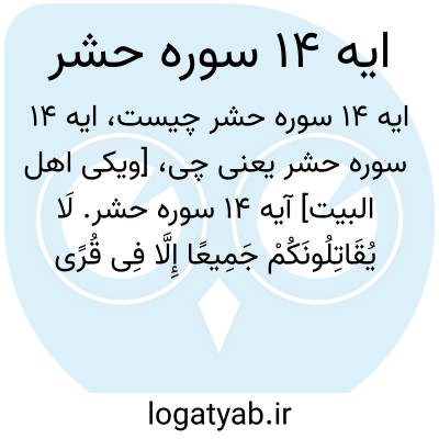 [ویکی اهل البیت] آیه 14 سوره حشر. لَا یُقَاتِلُونَکُمْ جَمِیعًا إِلَّا فِی قُرًی مُحَصَّنَةٍ أَوْ مِنْ وَرَاءِ جُدُرٍ ۚ بَأْسُهُمْ بَیْنَهُمْ شَدِیدٌ ۚ تَحْسَبُهُمْ جَمِیعًا وَقُلُوبُهُمْ شَتَّیٰ ۚ ذَٰلِکَ بِأَنَّهُمْ قَوْمٌ لَا یَعْقِلُونَ