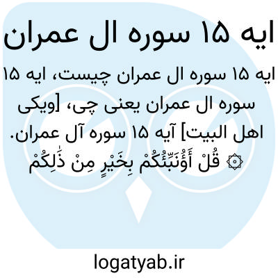 [ویکی اهل البیت] آیه 15 سوره آل عمران. ۞ قُلْ أَؤُنَبِّئُکُمْ بِخَیْرٍ مِنْ ذَٰلِکُمْ ۚ لِلَّذِینَ اتَّقَوْا عِنْدَ رَبِّهِمْ جَنَّاتٌ تَجْرِی مِنْ تَحْتِهَا الْأَنْهَارُ خَالِدِینَ فِیهَا وَأَزْوَاجٌ مُطَهَّرَةٌ وَرِضْوَانٌ مِنَ اللَّهِ ۗ وَاللَّهُ بَصِیرٌ بِالْعِبَادِ