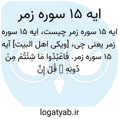 [ویکی اهل البیت] آیه 15 سوره زمر. فَاعْبُدُوا مَا شِئْتُمْ مِنْ دُونِهِ ۗ قُلْ إِنَّ الْخَاسِرِینَ الَّذِینَ خَسِرُوا أَنْفُسَهُمْ وَأَهْلِیهِمْ یَوْمَ الْقِیَامَةِ ۗ أَلَا ذَٰلِکَ هُوَ الْخُسْرَانُ الْمُبِینُ