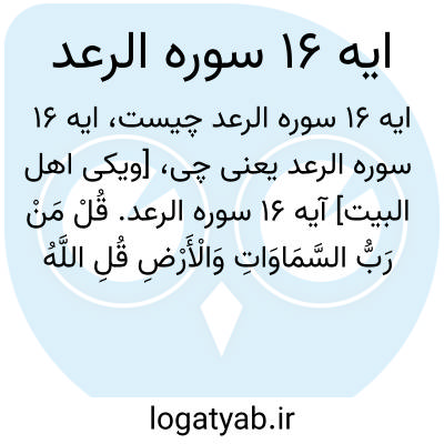 [ویکی اهل البیت] آیه 16 سوره الرعد. قُلْ مَنْ رَبُّ السَّمَاوَاتِ وَالْأَرْضِ قُلِ اللَّهُ ۚ قُلْ أَفَاتَّخَذْتُمْ مِنْ دُونِهِ أَوْلِیَاءَ لَا یَمْلِکُونَ لِأَنْفُسِهِمْ نَفْعًا وَلَا ضَرًّا ۚ قُلْ هَلْ یَسْتَوِی الْأَعْمَیٰ وَالْبَصِیرُ أَمْ هَلْ تَسْتَوِی الظُّلُمَاتُ وَالنُّورُ ۗ أَمْ جَعَلُوا لِلَّهِ شُرَکَاءَ خَلَقُوا کَخَلْقِهِ فَتَشَابَهَ الْخَلْقُ عَلَیْهِمْ ۚ قُلِ اللَّهُ خَالِقُ کُلِّ شَیْءٍ وَهُوَ الْوَاحِدُ الْقَهَّارُ