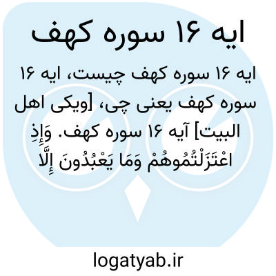 [ویکی اهل البیت] آیه 16 سوره کهف. وَإِذِ اعْتَزَلْتُمُوهُمْ وَمَا یَعْبُدُونَ إِلَّا اللَّهَ فَأْوُوا إِلَی الْکَهْفِ یَنْشُرْ لَکُمْ رَبُّکُمْ مِنْ رَحْمَتِهِ وَیُهَیِّئْ لَکُمْ مِنْ أَمْرِکُمْ مِرْفَقًا