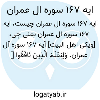 [ویکی اهل البیت] آیه 167 سوره آل عمران. وَلِیَعْلَمَ الَّذِینَ نَافَقُوا ۚ وَقِیلَ لَهُمْ تَعَالَوْا قَاتِلُوا فِی سَبِیلِ اللَّهِ أَوِ ادْفَعُوا ۖ قَالُوا لَوْ نَعْلَمُ قِتَالًا لَاتَّبَعْنَاکُمْ ۗ هُمْ لِلْکُفْرِ یَوْمَئِذٍ أَقْرَبُ مِنْهُمْ لِلْإِیمَانِ ۚ یَقُولُونَ بِأَفْوَاهِهِمْ مَا لَیْسَ فِی قُلُوبِهِمْ ۗ وَاللَّهُ أَعْلَمُ بِمَا یَکْتُمُونَ