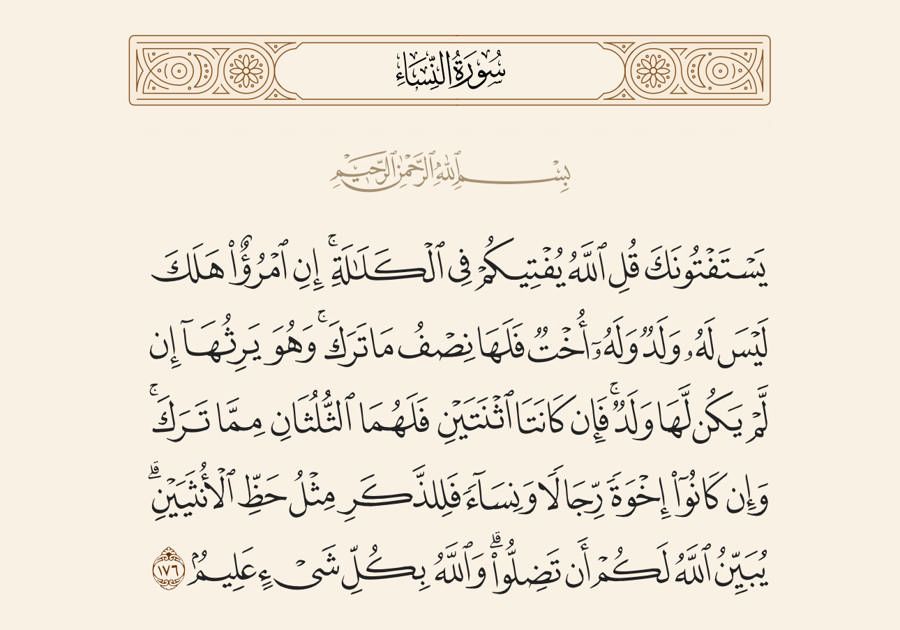 آیه 176 سوره نساء به این صورت است: «یَسْتَفْتُونَکَ قُلِ اللَّهُ یُفْتِیکُمْ فِی الْکَلَالَةِ ۚ إِنِ امْرُؤٌ هَلَکَ لَیْسَ لَهُ وَلَدٌ وَلَهُ أُخْتٌ فَلَهَا نِصْفُ مَا تَرَکَ ۚ وَهُوَ یَرِثُهَا إِنْ لَمْ یَکُنْ لَهَا وَلَدٌ ۚ فَإِنْ کَانَتَا اثْنَتَیْنِ فَلَهُمَا الثُّلُثَانِ مِمَّا تَرَکَ ۚ وَإِنْ کَانُوا إِخْوَةً رِجَالًا وَنِسَاءً فَلِلذَّکَرِ مِثْلُ حَظِّ الْأُنْثَیَیْنِ ۗ یُبَیِّنُ اللَّهُ لَکُمْ أَنْ تَضِلُّوا ۗ وَاللَّهُ بِکُلِّ شَیْءٍ عَلِیمٌ».