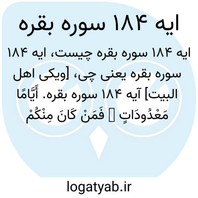 [ویکی اهل البیت] آیه 184 سوره بقره. أَیَّامًا مَعْدُودَاتٍ ۚ فَمَنْ کَانَ مِنْکُمْ مَرِیضًا أَوْ عَلَیٰ سَفَرٍ فَعِدَّةٌ مِنْ أَیَّامٍ أُخَرَ ۚ وَعَلَی الَّذِینَ یُطِیقُونَهُ فِدْیَةٌ طَعَامُ مِسْکِینٍ ۖ فَمَنْ تَطَوَّعَ خَیْرًا فَهُوَ خَیْرٌ لَهُ ۚ وَأَنْ تَصُومُوا خَیْرٌ لَکُمْ ۖ إِنْ کُنْتُمْ تَعْلَمُونَ