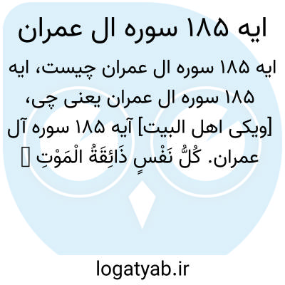 [ویکی اهل البیت] آیه 185 سوره آل عمران. کُلُّ نَفْسٍ ذَائِقَةُ الْمَوْتِ ۗ وَإِنَّمَا تُوَفَّوْنَ أُجُورَکُمْ یَوْمَ الْقِیَامَةِ ۖ فَمَنْ زُحْزِحَ عَنِ النَّارِ وَأُدْخِلَ الْجَنَّةَ فَقَدْ فَازَ ۗ وَمَا الْحَیَاةُ الدُّنْیَا إِلَّا مَتَاعُ الْغُرُورِ