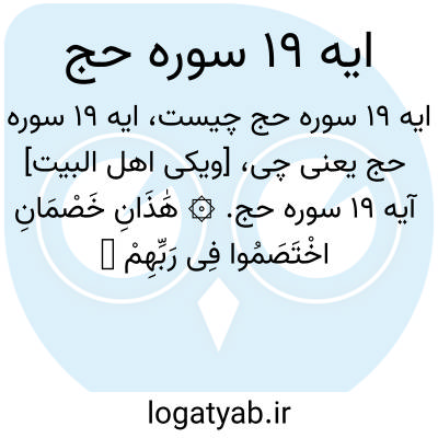 [ویکی اهل البیت] آیه 19 سوره حج. ۞ هَٰذَانِ خَصْمَانِ اخْتَصَمُوا فِی رَبِّهِمْ ۖ فَالَّذِینَ کَفَرُوا قُطِّعَتْ لَهُمْ ثِیَابٌ مِنْ نَارٍ یُصَبُّ مِنْ فَوْقِ رُءُوسِهِمُ الْحَمِیمُ
