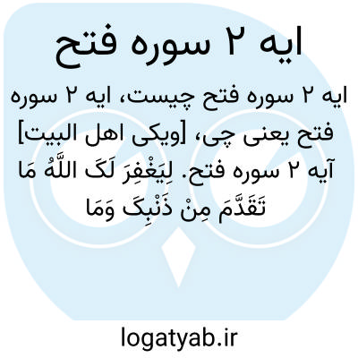 [ویکی اهل البیت] آیه 2 سوره فتح. لِیَغْفِرَ لَکَ اللَّهُ مَا تَقَدَّمَ مِنْ ذَنْبِکَ وَمَا تَأَخَّرَ وَیُتِمَّ نِعْمَتَهُ عَلَیْکَ وَیَهْدِیَکَ صِرَاطًا مُسْتَقِیمًا