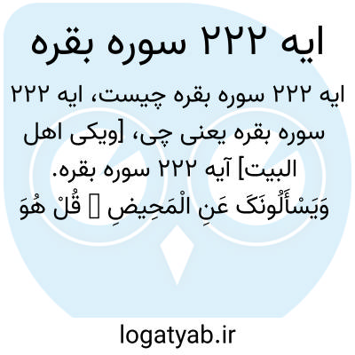 [ویکی اهل البیت] آیه 222 سوره بقره. وَیَسْأَلُونَکَ عَنِ الْمَحِیضِ ۖ قُلْ هُوَ أَذًی فَاعْتَزِلُوا النِّسَاءَ فِی الْمَحِیضِ ۖ وَلَا تَقْرَبُوهُنَّ حَتَّیٰ یَطْهُرْنَ ۖ فَإِذَا تَطَهَّرْنَ فَأْتُوهُنَّ مِنْ حَیْثُ أَمَرَکُمُ اللَّهُ ۚ إِنَّ اللَّهَ یُحِبُّ التَّوَّابِینَ وَیُحِبُّ الْمُتَطَهِّرِینَ