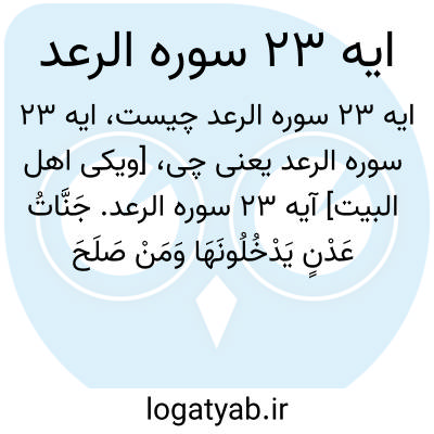 [ویکی اهل البیت] آیه 23 سوره الرعد. جَنَّاتُ عَدْنٍ یَدْخُلُونَهَا وَمَنْ صَلَحَ مِنْ آبَائِهِمْ وَأَزْوَاجِهِمْ وَذُرِّیَّاتِهِمْ ۖ وَالْمَلَائِکَةُ یَدْخُلُونَ عَلَیْهِمْ مِنْ کُلِّ بَابٍ