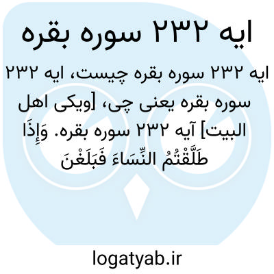 [ویکی اهل البیت] آیه 232 سوره بقره. وَإِذَا طَلَّقْتُمُ النِّسَاءَ فَبَلَغْنَ أَجَلَهُنَّ فَلَا تَعْضُلُوهُنَّ أَنْ یَنْکِحْنَ أَزْوَاجَهُنَّ إِذَا تَرَاضَوْا بَیْنَهُمْ بِالْمَعْرُوفِ ۗ ذَٰلِکَ یُوعَظُ بِهِ مَنْ کَانَ مِنْکُمْ یُؤْمِنُ بِاللَّهِ وَالْیَوْمِ الْآخِرِ ۗ ذَٰلِکُمْ أَزْکَیٰ لَکُمْ وَأَطْهَرُ ۗ وَاللَّهُ یَعْلَمُ وَأَنْتُمْ لَا تَعْلَمُونَ