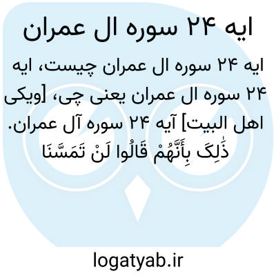 [ویکی اهل البیت] آیه 24 سوره آل عمران. ذَٰلِکَ بِأَنَّهُمْ قَالُوا لَنْ تَمَسَّنَا النَّارُ إِلَّا أَیَّامًا مَعْدُودَاتٍ ۖ وَغَرَّهُمْ فِی دِینِهِمْ مَا کَانُوا یَفْتَرُونَ