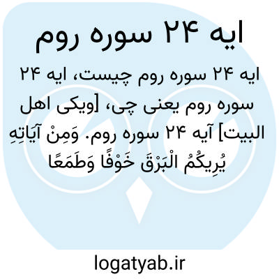 [ویکی اهل البیت] آیه 24 سوره روم. وَمِنْ آیَاتِهِ یُرِیکُمُ الْبَرْقَ خَوْفًا وَطَمَعًا وَیُنَزِّلُ مِنَ السَّمَاءِ مَاءً فَیُحْیِی بِهِ الْأَرْضَ بَعْدَ مَوْتِهَا ۚ إِنَّ فِی ذَٰلِکَ لَآیَاتٍ لِقَوْمٍ یَعْقِلُونَ