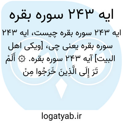 [ویکی اهل البیت] آیه 243 سوره بقره. ۞ أَلَمْ تَرَ إِلَی الَّذِینَ خَرَجُوا مِنْ دِیَارِهِمْ وَهُمْ أُلُوفٌ حَذَرَ الْمَوْتِ فَقَالَ لَهُمُ اللَّهُ مُوتُوا ثُمَّ أَحْیَاهُمْ ۚ إِنَّ اللَّهَ لَذُو فَضْلٍ عَلَی النَّاسِ وَلَٰکِنَّ أَکْثَرَ النَّاسِ لَا یَشْکُرُونَ
