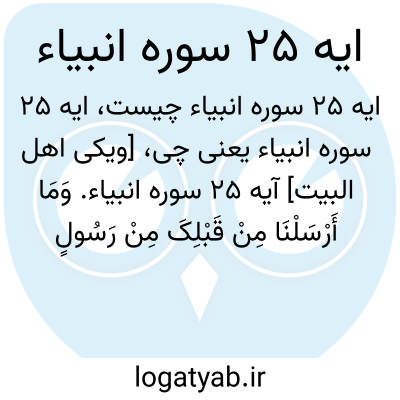[ویکی اهل البیت] آیه 25 سوره انبیاء. وَمَا أَرْسَلْنَا مِنْ قَبْلِکَ مِنْ رَسُولٍ إِلَّا نُوحِی إِلَیْهِ أَنَّهُ لَا إِلَٰهَ إِلَّا أَنَا فَاعْبُدُونِ