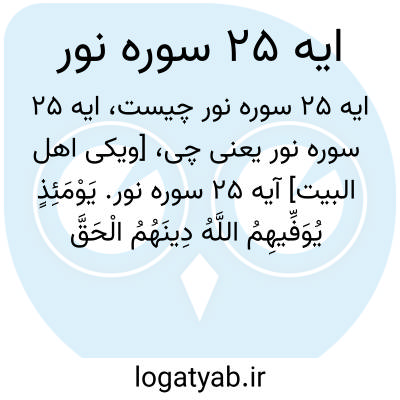 [ویکی اهل البیت] آیه 25 سوره نور. یَوْمَئِذٍ یُوَفِّیهِمُ اللَّهُ دِینَهُمُ الْحَقَّ وَیَعْلَمُونَ أَنَّ اللَّهَ هُوَ الْحَقُّ الْمُبِینُ