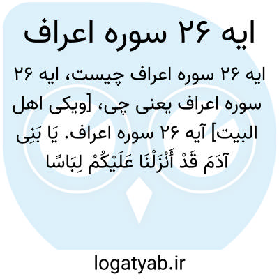 [ویکی اهل البیت] آیه 26 سوره اعراف. یَا بَنِی آدَمَ قَدْ أَنْزَلْنَا عَلَیْکُمْ لِبَاسًا یُوَارِی سَوْآتِکُمْ وَرِیشًا ۖ وَلِبَاسُ التَّقْوَیٰ ذَٰلِکَ خَیْرٌ ۚ ذَٰلِکَ مِنْ آیَاتِ اللَّهِ لَعَلَّهُمْ یَذَّکَّرُونَ