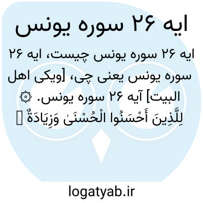 [ویکی اهل البیت] آیه 26 سوره یونس. ۞ لِلَّذِینَ أَحْسَنُوا الْحُسْنَیٰ وَزِیَادَةٌ ۖ وَلَا یَرْهَقُ وُجُوهَهُمْ قَتَرٌ وَلَا ذِلَّةٌ ۚ أُولَٰئِکَ أَصْحَابُ الْجَنَّةِ ۖ هُمْ فِیهَا خَالِدُونَ