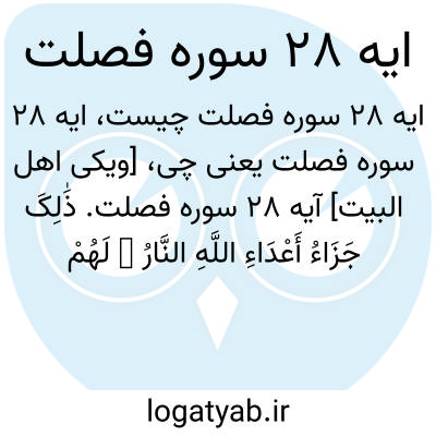 [ویکی اهل البیت] آیه 28 سوره فصلت. ذَٰلِکَ جَزَاءُ أَعْدَاءِ اللَّهِ النَّارُ ۖ لَهُمْ فِیهَا دَارُ الْخُلْدِ ۖ جَزَاءً بِمَا کَانُوا بِآیَاتِنَا یَجْحَدُونَ