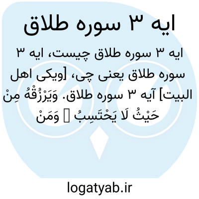 [ویکی اهل البیت] آیه 3 سوره طلاق. وَیَرْزُقْهُ مِنْ حَیْثُ لَا یَحْتَسِبُ ۚ وَمَنْ یَتَوَکَّلْ عَلَی اللَّهِ فَهُوَ حَسْبُهُ ۚ إِنَّ اللَّهَ بَالِغُ أَمْرِهِ ۚ قَدْ جَعَلَ اللَّهُ لِکُلِّ شَیْءٍ قَدْرًا