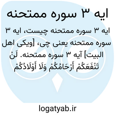 [ویکی اهل البیت] آیه 3 سوره ممتحنه. لَنْ تَنْفَعَکُمْ أَرْحَامُکُمْ وَلَا أَوْلَادُکُمْ ۚ یَوْمَ الْقِیَامَةِ یَفْصِلُ بَیْنَکُمْ ۚ وَاللَّهُ بِمَا تَعْمَلُونَ بَصِیرٌ